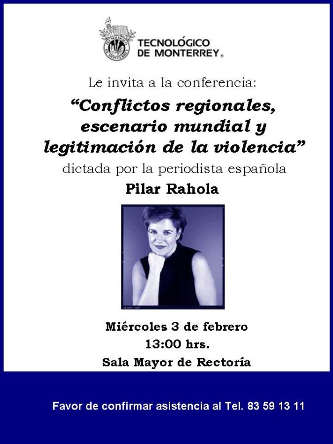 Durante la conferencia titulada “Conflictos regionales, escenario mundial y legitimación de la violencia”, la periodista catalana Pilar Rahola dio algunas indicaciones a los jóvenes estudiantes del ITESM en caso de desear dedicarse al mundo del periodismo.