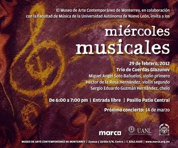 Trío de Cuerdas Glazunov en Marco 28 febrero 2012 / anaportnoy Comparte:Tweet Haz clic para enviar un enlace por correo electrónico a un amigo (Se abre en una ventana nueva) Correo electrónico Más Haz clic para imprimir (Se abre en una ventana nueva) Imprimir Me gusta Cargando... Relacionado