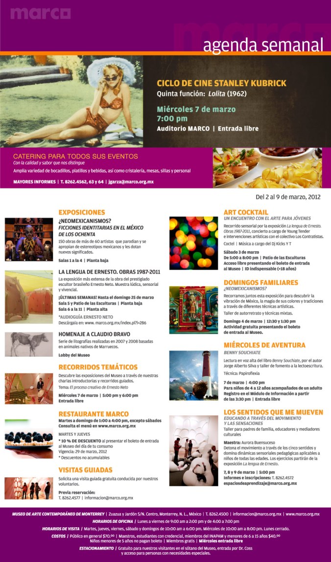 MARCO: agenda semanal del 2 al 9 de marzo 2 marzo 2012 / anaportnoy Comparte:Tweet Haz clic para enviar un enlace por correo electrónico a un amigo (Se abre en una ventana nueva) Correo electrónico Más Haz clic para imprimir (Se abre en una ventana nueva) Imprimir Me gusta Cargando... Relacionado
