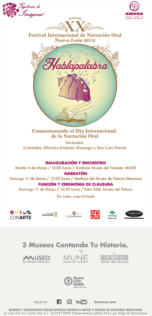 XX Festival Internacional de Narración Oral Nuevo León 2012 7 marzo 201213 marzo 2012 / anaportnoy Comparte:Tweet Haz clic para enviar un enlace por correo electrónico a un amigo (Se abre en una ventana nueva) Correo electrónico Más Haz clic para imprimir (Se abre en una ventana nueva) Imprimir Me gusta Cargando... Relacionado