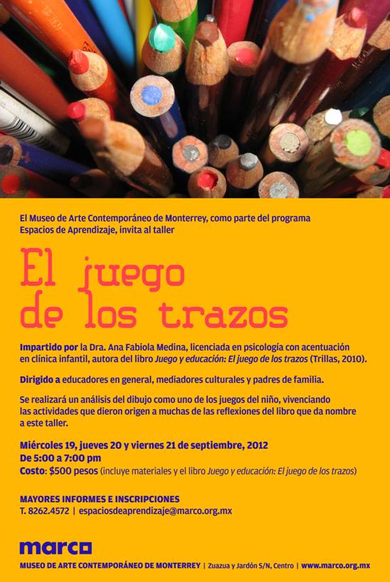 Taller «El juego de los trazos» en MARCO 18 septiembre 2012 / anaportnoy Comparte:Tweet Haz clic para enviar un enlace por correo electrónico a un amigo (Se abre en una ventana nueva) Correo electrónico Más Haz clic para imprimir (Se abre en una ventana nueva) Imprimir Me gusta Cargando... Relacionado
