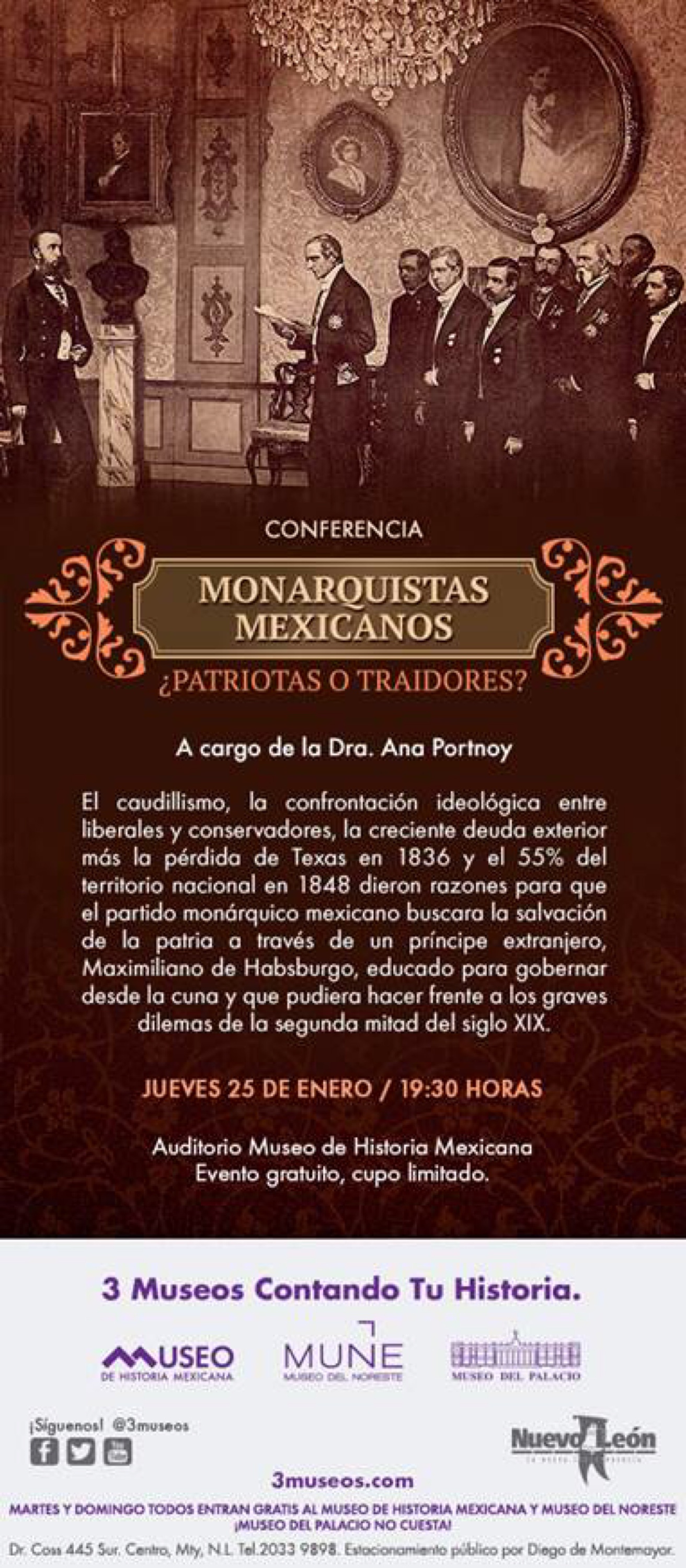 Fuente: 3Museos. Conferencia. Monarquistas Mexicanos. ¿Patriotas o Traidores? impartida por Ana Portnoy en el Museo de Historia Mexicana, 25 de enero 2018. En You Tube: <https://www.youtube.com/watch?v=HmDeGHxGuvE>