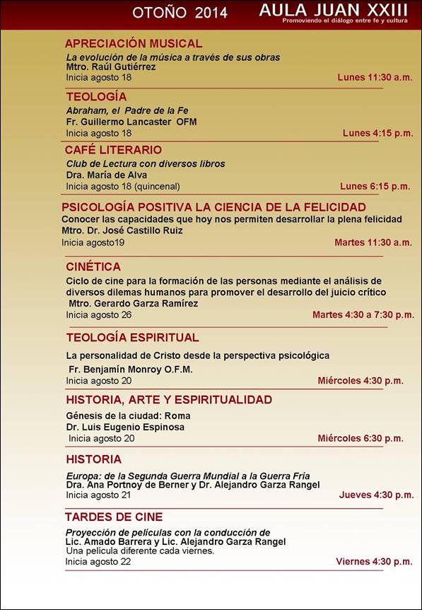Lugar: Aula Juan XXIII, Humberto Lobo y Río Rhin en la Colonia del Valle.